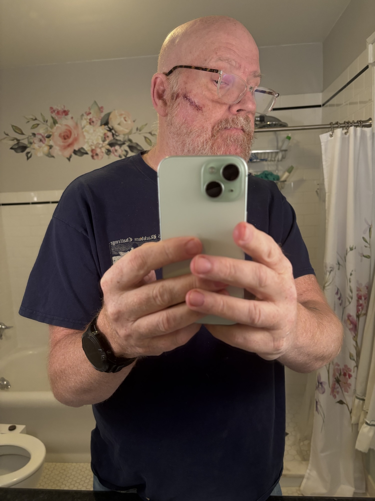 Yesterday I got my melanoma excised. Just like last time, the same PA proved unable to bandage me in a way that sticks. I tried to shave around the area so I could bandage it, but the shitty no-name bandaids I bought at CVS still didn’t stick. I think I’ll need to shave with a blade instead of an electric and buy some better bandaids. I took a picture without the bandaid on, and it’s quite spectacular. A Heidelberg fencer would be proud.